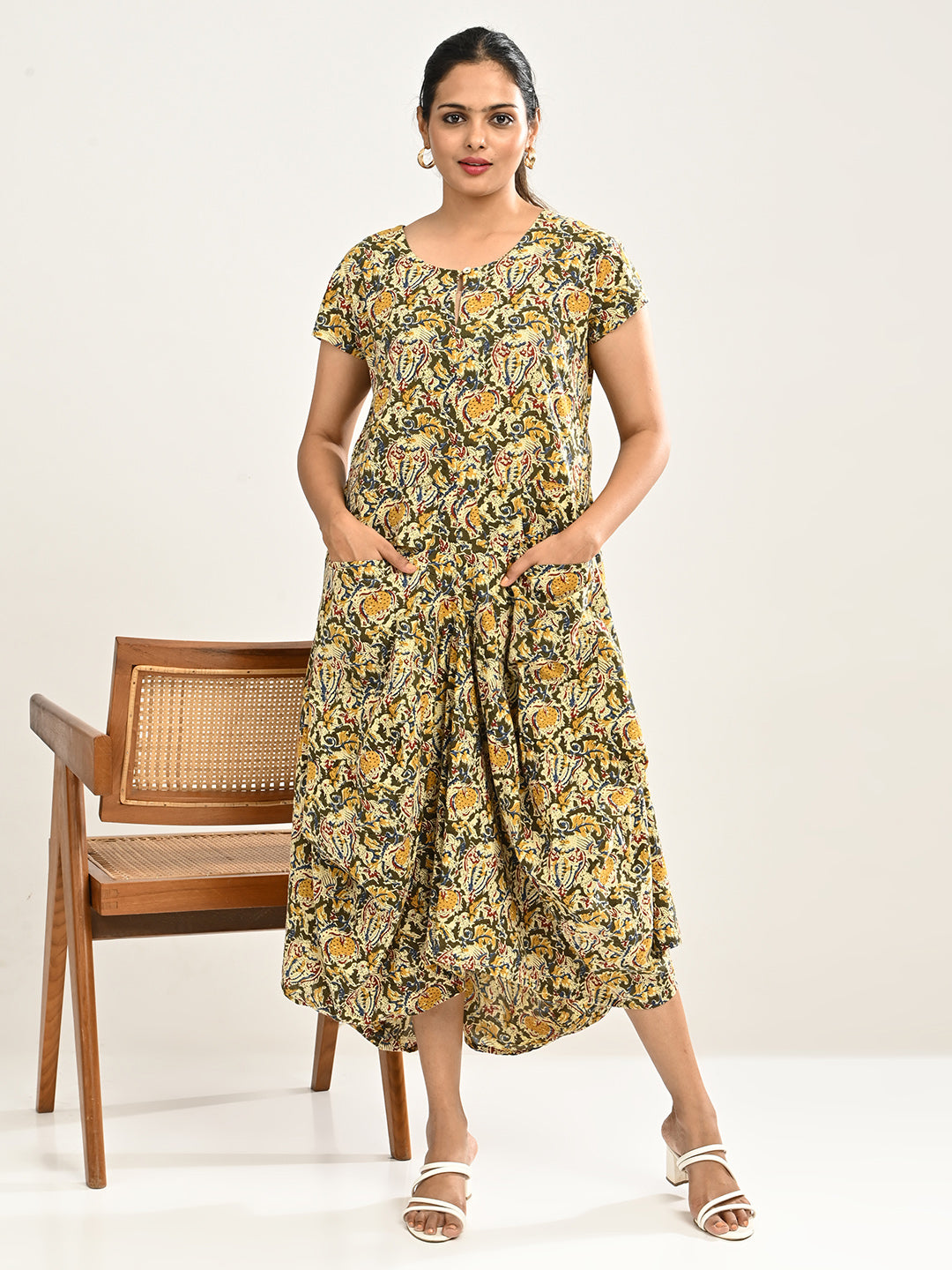 A sleeveless asymmetrical dress with patchwork in Navy blue, cream, and olive. Features layered ruffles, traditional motifs, and a flowy, ethnic-fusion silhouette.